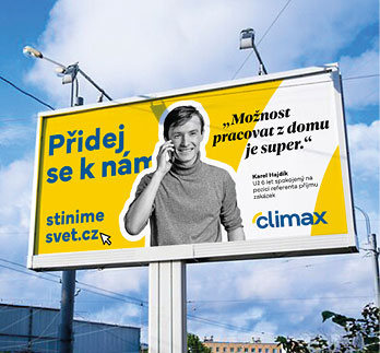 Pro CLIMAX kromě firemního magazínu navrhujeme taky billboardy. Ty jsou zaměřeny především na nábor na pracovní pozice. Billboardy se vyskytují většinou na stejných místech. Proto jsme zvolili strategii, kdy budou billboardy vylepovány po sobě vždy v trochu jiném barevném i grafickém provedení. Výsledkem jsou fungující úderné billboardy, kterých si potencionální zaměstnanec všimne.