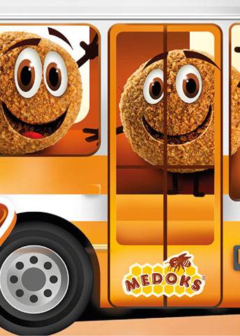 Obal Medoksíků jsme už minulosti zpracovávali. Vzhledem k hravému pojetí samotných Medoksíků jsme si řekli, že by vyžadoval i méně konzervativní design obalu. Proto jsme společně s vedením firmy vymysleli zcela nový formát balení – Medoksíkový autobus! Ten jsme v našem studiu ručně nakreslili a poté převedli do digitální podoby. Nový obal tak více cílí na děti a svým vizuálním pojetím je daleko veselejší než jeho předchůdce, který se drží ostřílené řady produktů Medoks.