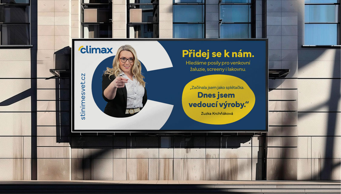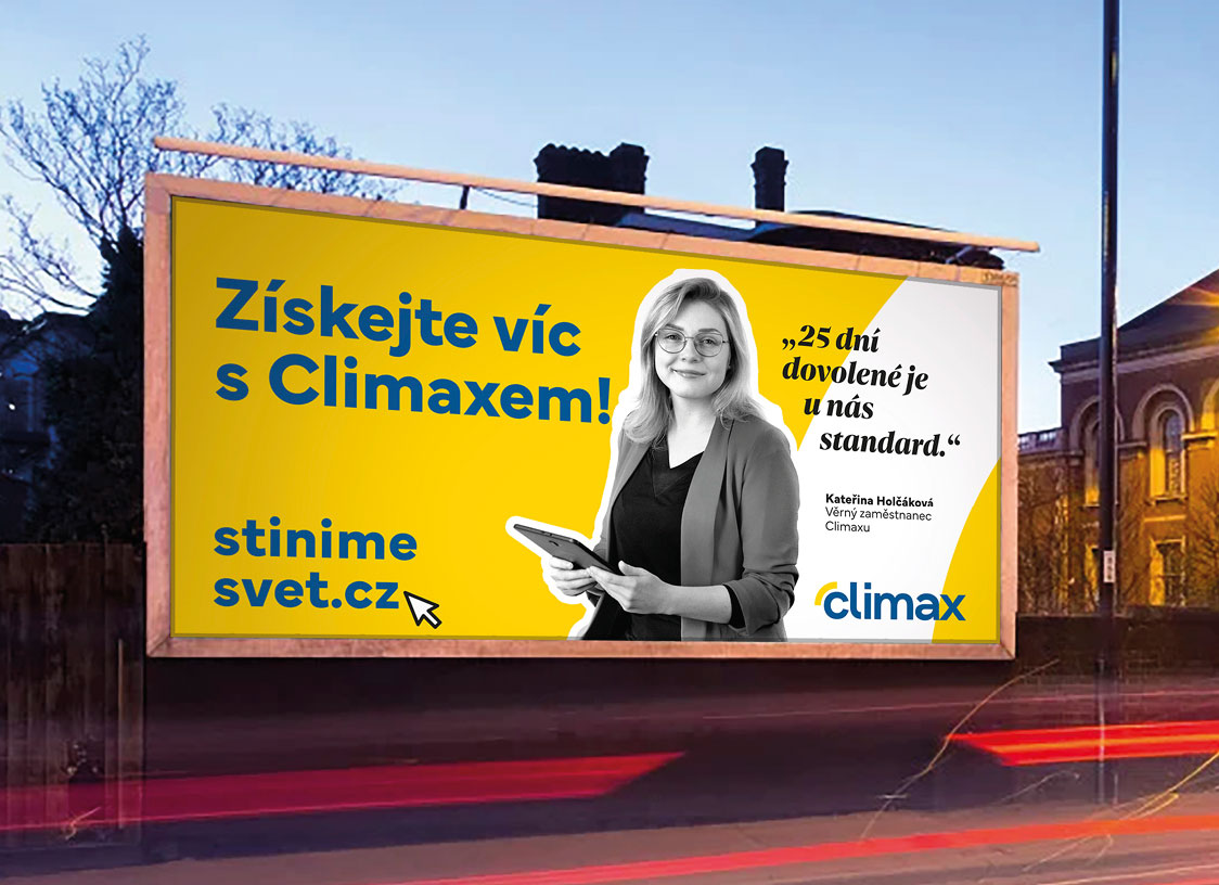 Pro CLIMAX kromě firemního magazínu navrhujeme taky billboardy. Ty jsou zaměřeny především na nábor na pracovní pozice. Billboardy se vyskytují většinou na stejných místech. Proto jsme zvolili strategii, kdy budou billboardy vylepovány po sobě vždy v trochu jiném barevném i grafickém provedení. Výsledkem jsou fungující úderné billboardy, kterých si potencionální zaměstnanec všimne.