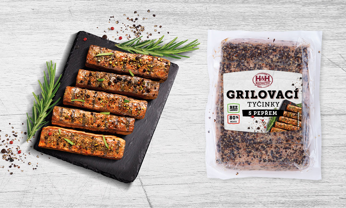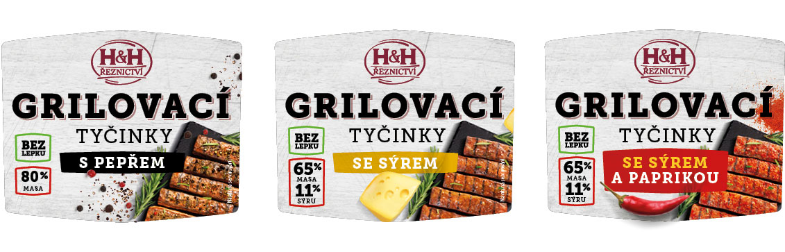 Řeznictví H+H jsme se postarali o design série etiket grilovacích tyčinek. K etiketám jsem vytvořili i image foto, které se na nich promítá. Pro toto řeznictví jsme redesignovali také etiketu masa do hamburgeru připraveného na gril.